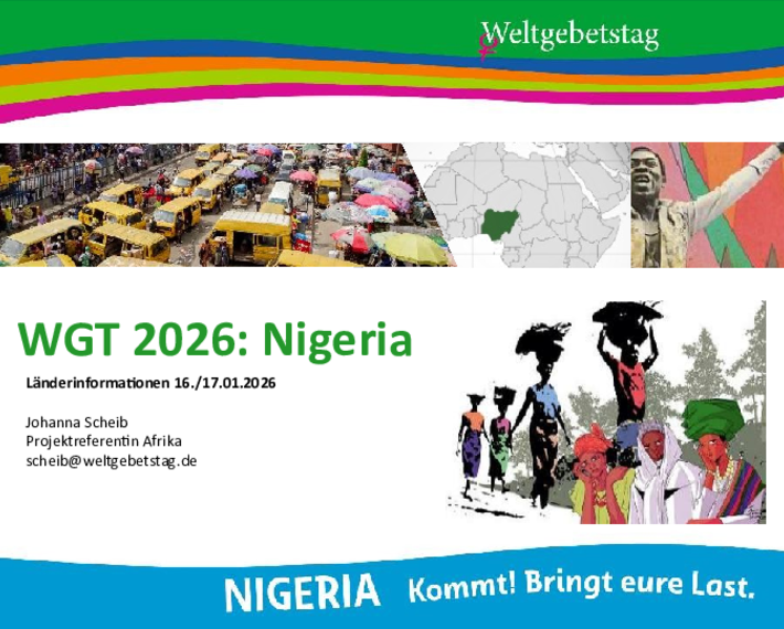 Einen persönlichen Eindruck von der Lebensrealität nigerianischer Frauen und einen authentischen Blick auf unser vielfältiges Weltgebetstagsland bietet die Online-Gesprächsveranstaltung „Nigerianische Frauen erzählen“ am Donnerstag, 19.2.26, ab 18 Uhr. Anmeldung bitte über wgt-anmeldung@evangelischefrauen.de , weitere Infos s. Flyer im Anhang.